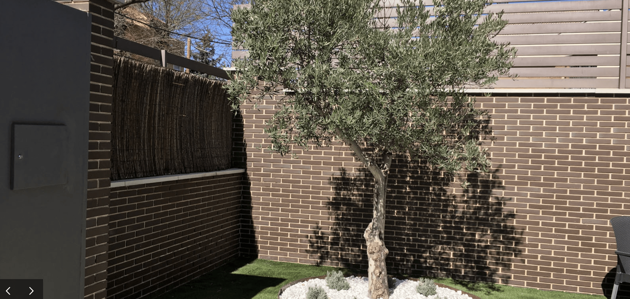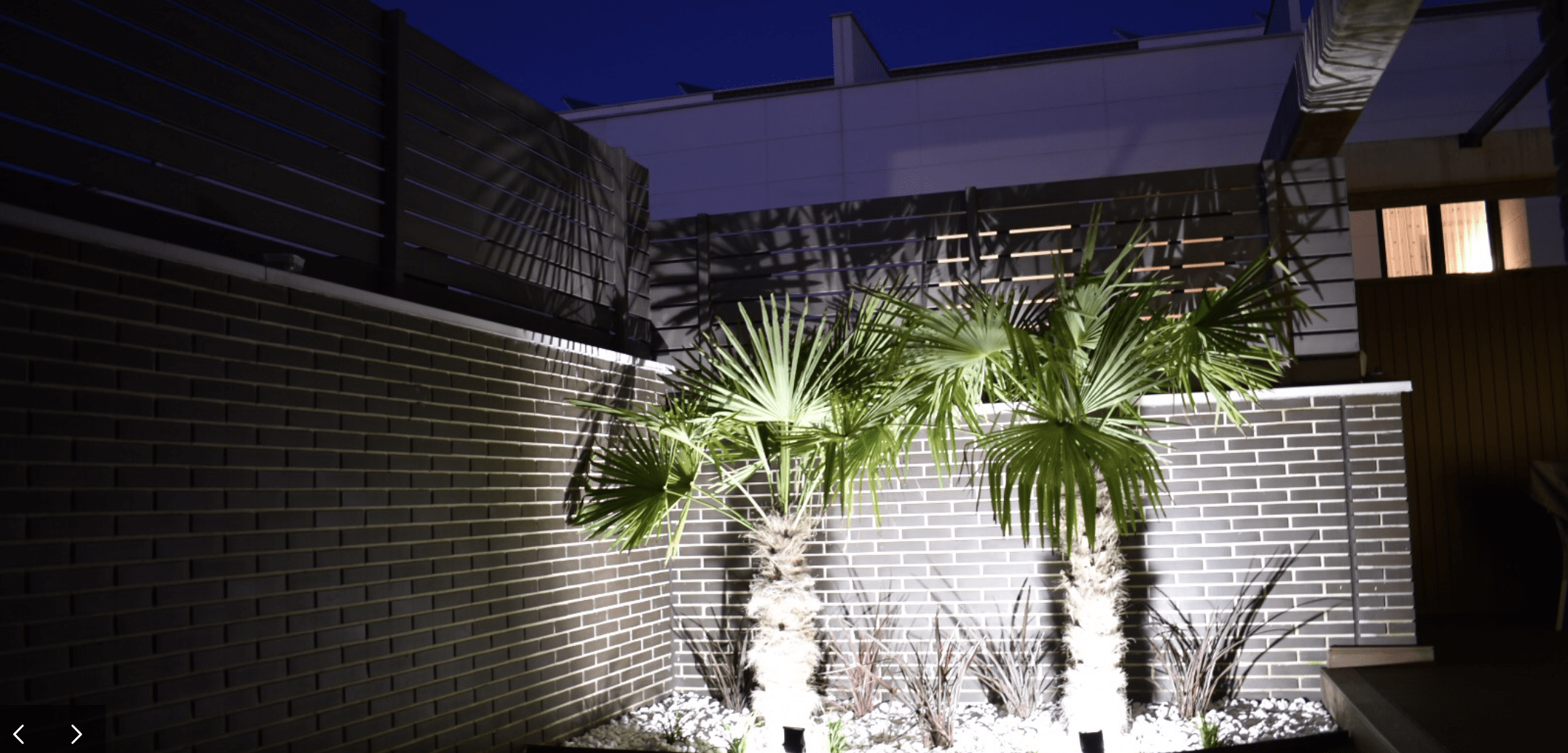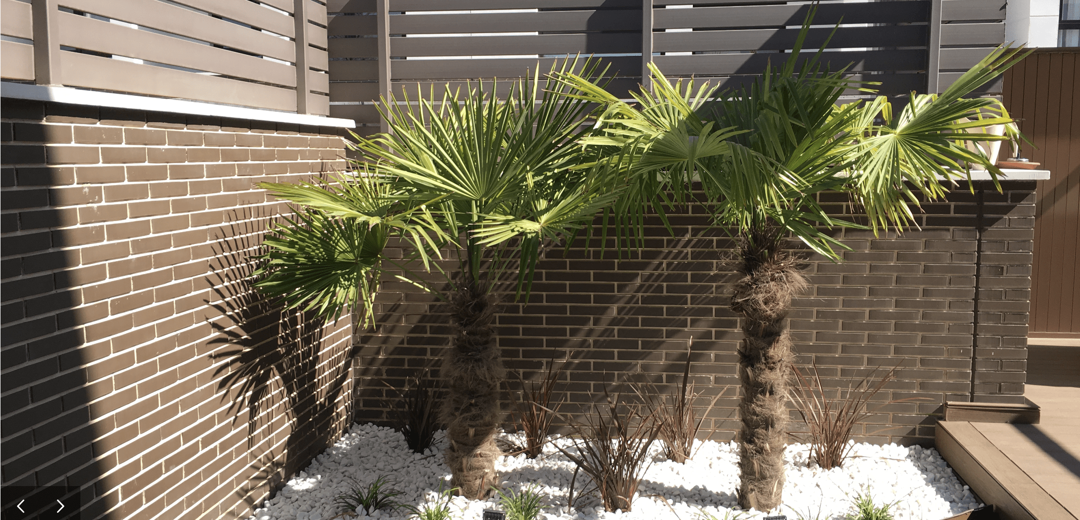 Un manto verde artificial, que aporta color y ofrece continuidad al espacio, conduce hasta el siguiente grupo de palmitos elevados, que en combinación con la piedra decorativa en tonos blancos ofrece un conjunto armonioso y elegante, para un jardín racional, que toma como referencia la sostenibilidad en su diseño.