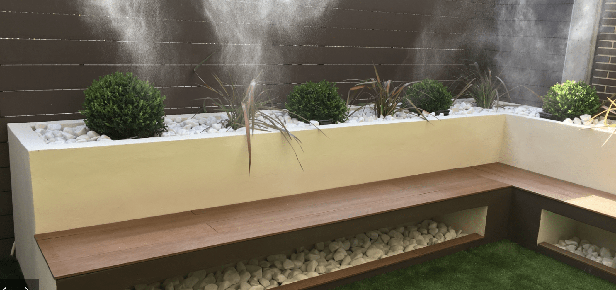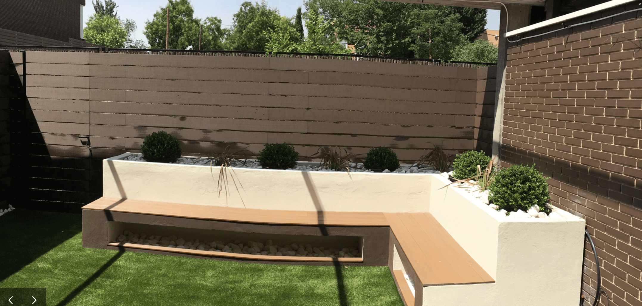 Una pérgola bajo la que guarecerse de los rayos solares, mobiliario en madera a juego con el vallado en tarima tecnológica (que ofrece al mismo tiempo protección frente a miradas ajenas) y un banco de obra suspendido sobre un tapiz de piedra natural blanca, que a su vez es escoltado por jardineras, conforman un conjunto armónico y pensado para su uso de día y de noche. Además, destaca en este último sentido la incorporación de un sistema de micronebulización, para refrescar el ambiente cuando las altas temperaturas dificultan la estancia en exteriores y un cuidado sistema de iluminación para disfrutar del jardín en momentos de baja intensidad lumínica.